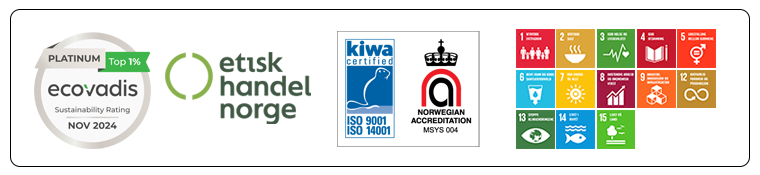 Artisti er ISO-sertifisert i Ledelsessystem for kvalitet (NS-EN ISO 9001:2015) og Ledelsessystem for miljø (NS-EN ISO 14001:2015). Vi har vært medlem av Etisk Handel Norge siden 2008 og har platinum-status fra EcoVadis på vårt bærekraftsarbeid.